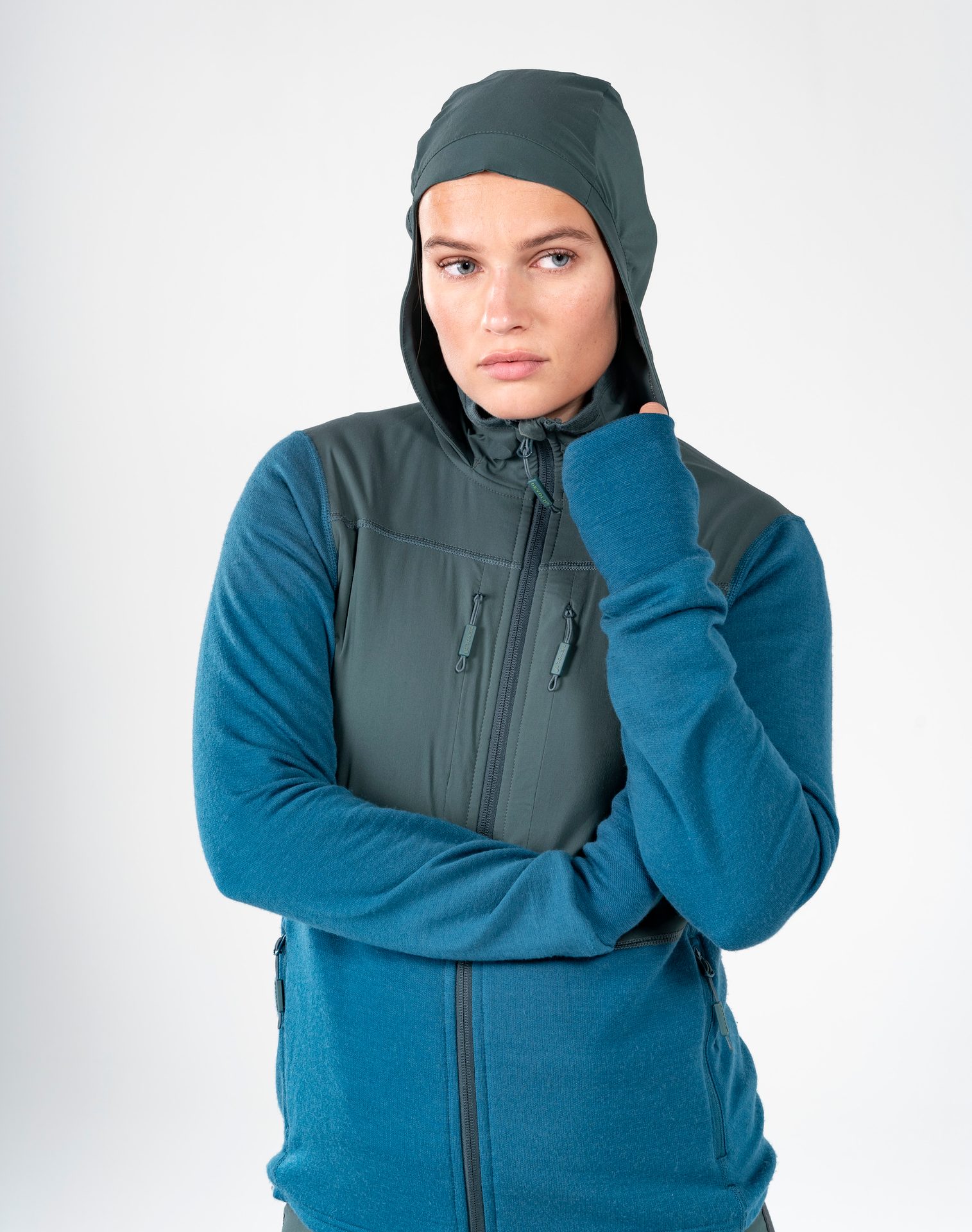 Extend your Herøy collection with the Hybrid jacket. The jacket is body-mapped and wind-resistant. It includes woven wind-resistant material on key areas for added protection against changing weather. The close-fitted hood can be tucked into the collar when not needed. The jacket has a soft Merino inside for insulation and temperature control, ensuring you stay warm and dry during mountain hikes.